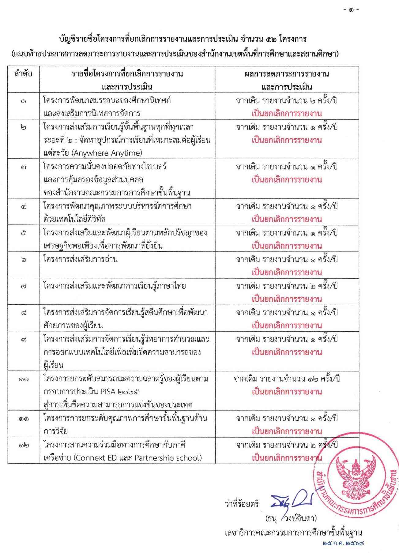 ยกเลิกการรายงาน 52 โครงการ ตามนโยบายลดภาระงานครู เพื่อให้ครูและบุคลากรทางการศึกษาได้มุ่งเน้นการจัดการเรียนการสอนและพัฒนาผู้เรียนได้เต็มศักยภาพ และมีประสิทธิภาพ สอดคล้อง สพฐ. นโยบายเรื่อง ลดภาระการประเมินของสถานศึกษาและปรับลดภาระงานที่ไม่จำเป็นหรือซ้ำซ้อน ประกาศเมื่อ 25 กรกฎาคม 2568